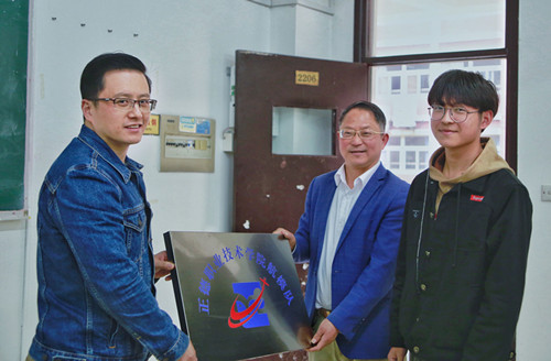 王俊从最初参与无人机专业建设的申报到亲眼目睹无人机专业成立并逐步开始壮大,他对此深有感触:“无人机专业适应目前社会需要,有着广阔的就业前景,同学们能够学习无人机专业,应感到十分幸运。”他希望大家能够着眼未来、立足当下,认真学习好专业技能,力争成为一名优秀的工匠型专业人才。随后,王俊同李秀成一起将带有航模队独特Logo的铜牌授予航模队队长。