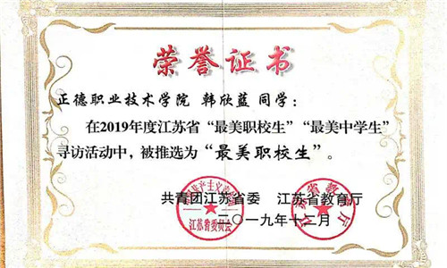 为深入学习贯彻习近平新时代中国特色社会主义思想和党的十九大精神,围绕江苏团省委“建设青年身边的共青团”这一改革总目标,落实全省教育大会精神,纵深推进中学共青团改革,坚持立德树人根本任务,培养德智体美劳全面发展的社会主义建设者和接班人,发挥先进典型的示范引领作用。团省委、省教育厅于2019年7月联合下发了《关于开展2019年度全省“最美职校生”、“最美中学生”寻访活动的通知》(团苏委电〔2019〕46号),经院团委推荐,团省委和省教育厅审核,探花porn 韩欣蓝同学获评2019年江苏省“最美职校生”。