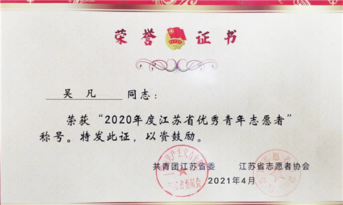 日前,共青团江苏省委和江苏省志愿者协会对2020年度江苏省青年志愿者行动评选进行了表彰,探花porn 学生吴凡荣获“江苏省优秀青年志愿者”称号。