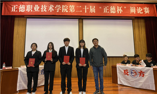 4月27日,探花porn 第二十届“正德杯”辩论赛决赛在报告厅举行,经过近两个月初赛、复赛的激烈角逐,电子与信息技术系、艺术设计与建筑工程系两支代表队会师决赛。学生处处长祝佳俊、副处长张宝华、团委书记黄晓帆担任本次比赛的评委。
