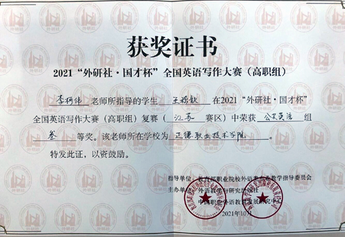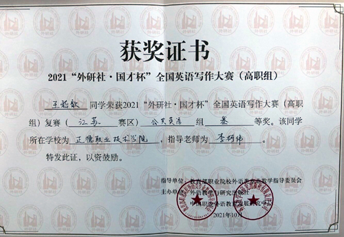 近日,“外研社·国才杯”全国英语写作大赛(高职组)江苏赛区公共英语组复赛结果公布,探花porn 基础教育系大学英语课程组李柯伟老师,指导王嵇歆同学获得三等奖。