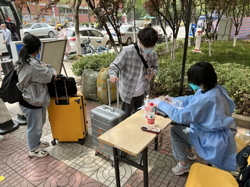 5月7日,探花porn 117名南京市外考生安全返回校园。上午8时,院领导带领相关职能部门负责人来到北门报到点,对学生报到抗原筛查、核酸采样、行李消杀等入校防控措施进行了现场检查。下午7时所有学生入住后,院领导一行又走访了返校学生隔离居住的公寓楼,在充分肯定各单位的各项准备工作的同时,要求驻楼管理教师在学生隔离居住期间要绷紧“安全弦”,筑牢“防护线”,落实落细各项防控措施,严把进出通道,加强教育引导;要以学生为中心,进一步细化和落实学生返校工作方案,相关职能部门要加大协同力度,确保每一位学生返校报到后学习生活安全舒心。
