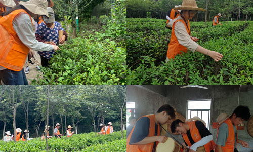 此次“三下乡”活动的第一天小队成员来到了横溪街道安民茶叶种植专业合作社,去体验了半天采茶时光。采茶小队进入茶园,映入眼帘的是一片“茶海”,成员们沐浴着幽幽茶香,穿插在茶树之间,迎着凉爽的山风。采茶梯田上,劳作乡野间,一个个嫩芽,从同学们的指尖走过,落进腰间的竹篓里。