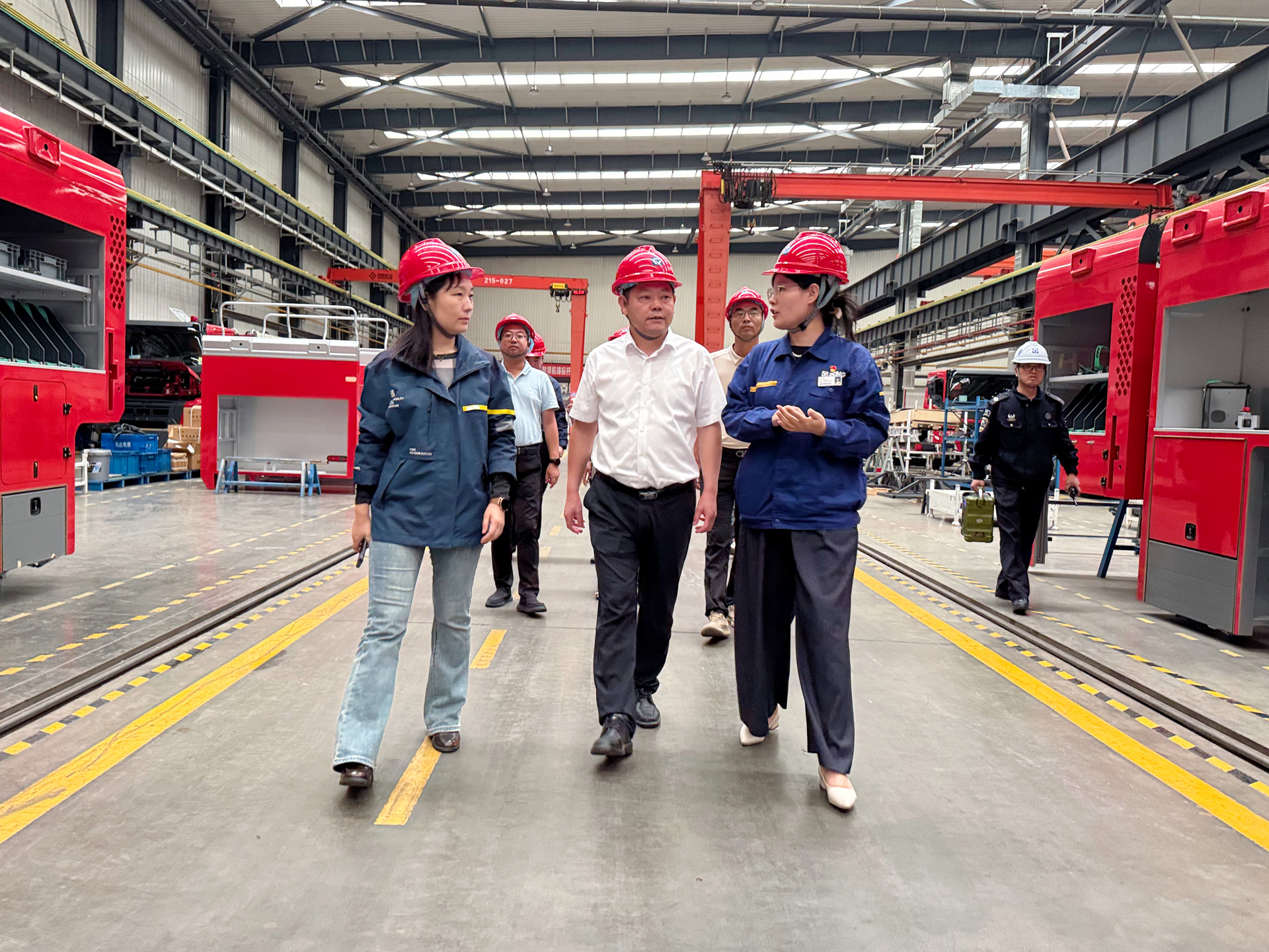 调研座谈结束后,在徐工消防安全装备有限公司总经理白琼等领导的陪同下,孙永荣一行走进徐工消防生产车间,实地考察企业生产流程、技术创新成果以及实训基地建设情况,并就进一步共建校企合作实践基地进行交流。